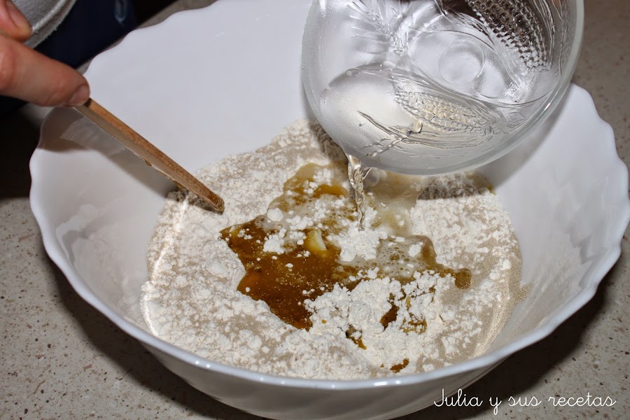 En un bol ponemos la harina, le hacemos un hueco en el centro y espolvoreamos la levadura seca de panadero. (Si es levadura fresca la disolvemos primero en el agua templada y luego la añadimos a la harina). Añadimos la sal, el azúcar, el agua templada, la manteca y el aceite de oliva.