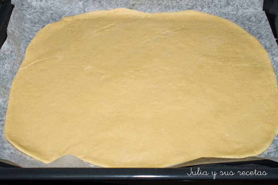 La estiramos con un rodillo sobre un papel vegetal. Tiene que quedar finita, de 1/2 cm aproximadamente.
