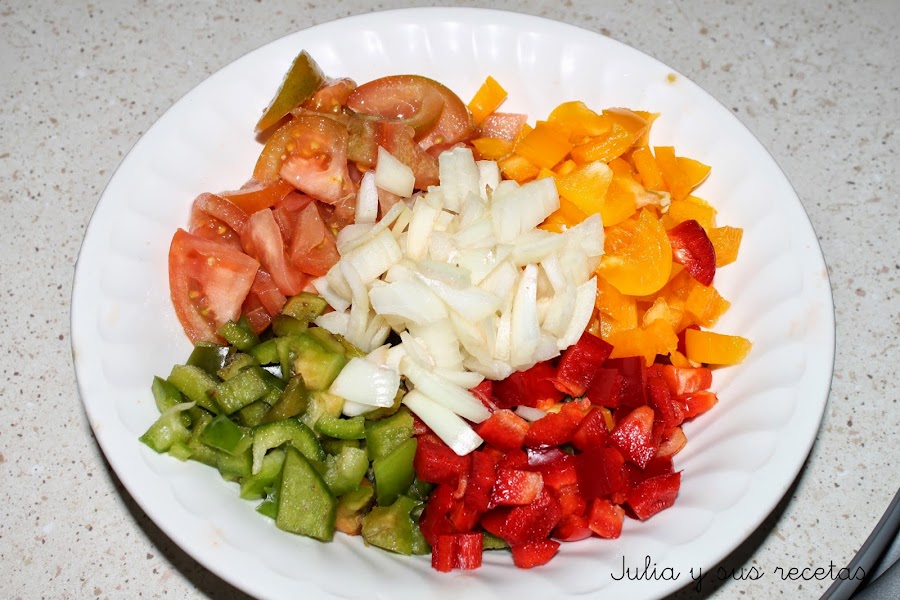 Mientras, picamos los pimientos, el tomate y la cebolla en cuadritos, les ponemos sal y un chorreón de aceite y los mezclamos.