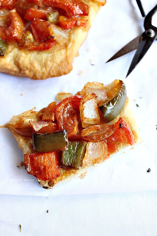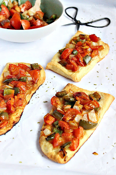 Colocamos las verduras sobre la masa, probamos un trozo de tomate para saber si necesita más sal y rectificamos.