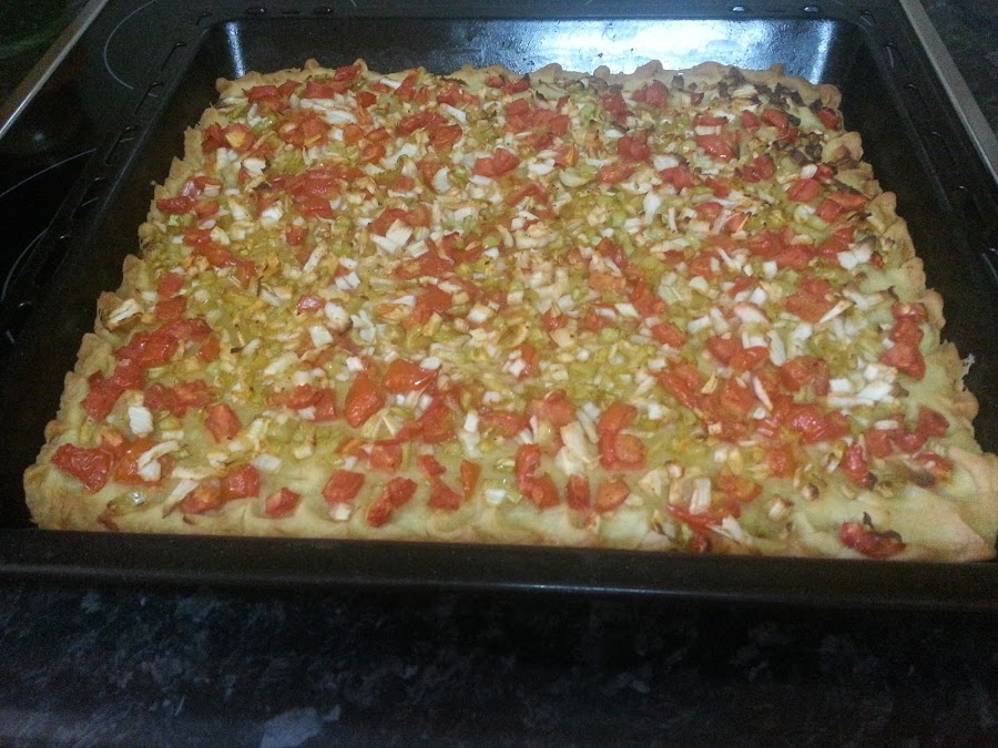 Embadurnamos la bandeja del horno con un poquito de aceite y extendemos la masa con las manos. No es necesario gastar toda la masa ya que no tiene que ser muy gruesa. La pinchamos con un tenedor y damos formas a los cantos.
