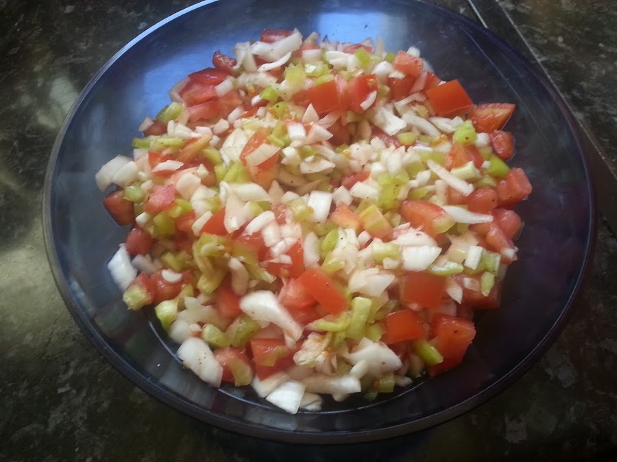 Cortamos los tomates, las cebollas y los pimientos. Salpimentamos y reservamos.