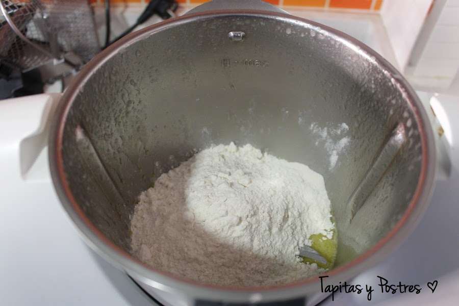 Añadimos la harina y programamos tres minutos a velocidad espiga.