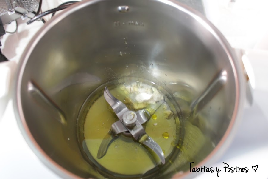 Ponemos en el vaso el agua, el aceite, la sal y la levadura. Mezclamos 30 segundos a velocidad 4.