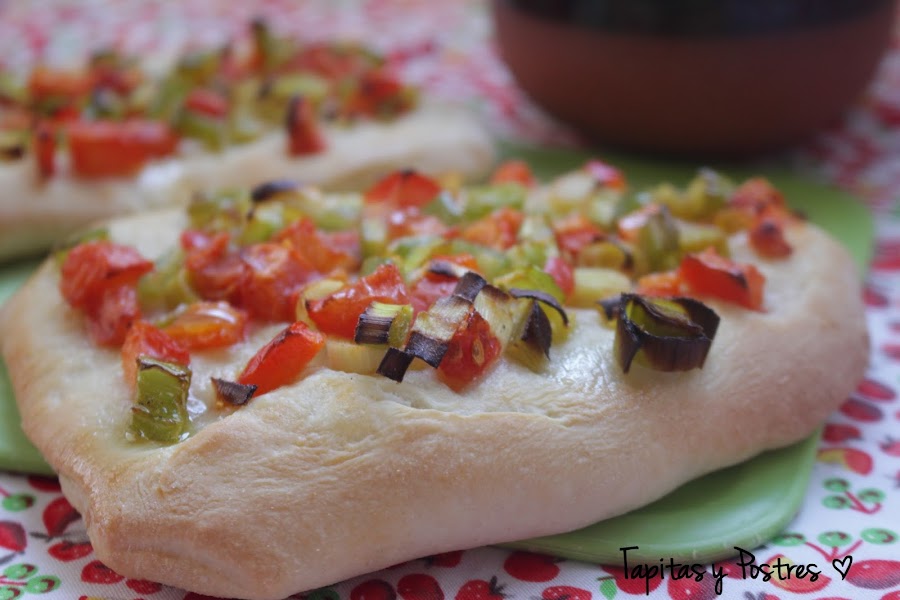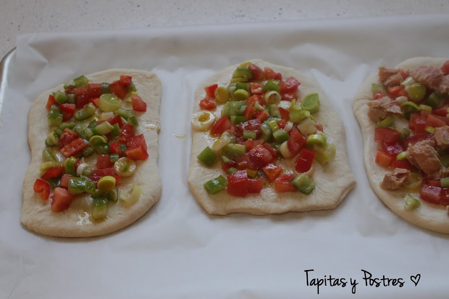 Vamos colocando las verduras sobre las cocas y las horneamos unos 18 o 20 minutos, hasta que veamos que la masa se dora y toma aspecto de pan.