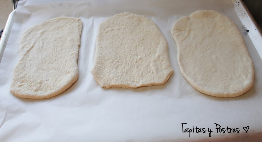 Hacemos lo mismo con las otras tres bolas y dejamos las cocas ya estiradas sobre papel de horno, que reposen en un sitio cálido una media hora.