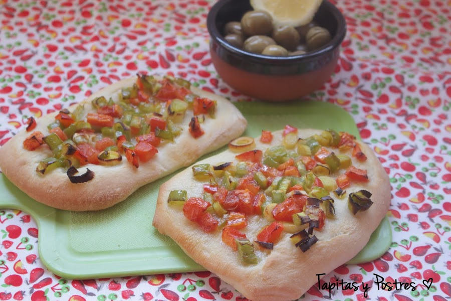 Consiste en una masa de pan plana y cuadrada, con verduras, normalmente tomate, pimiento rojo y verde y cebolla.