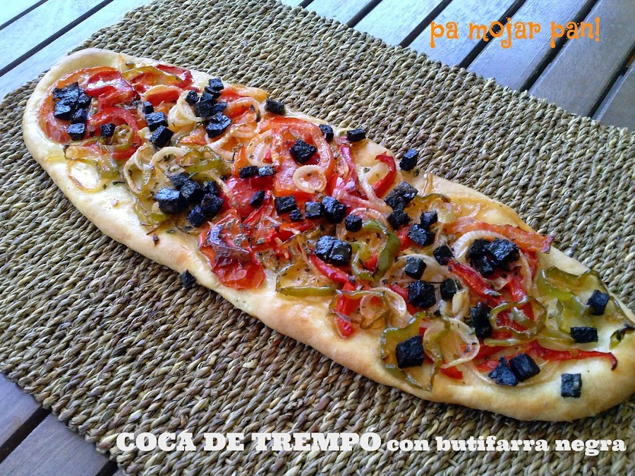 A continuación extendemos la verdura ya aliñada sobre las cocas que teníamos reservadas de manera que quede bien repartida por toda la superficie. Nosotros también echamos la butifarra negra pero tal y como comentamos más adelante es mejor añadirla un poco más tarde ya que al tratarse de dados pequeñitos se tuestan demasiado. Volvemos a echar un chorrito de aceite por encima e introducimos en el horno que teníamos previamente caliente.