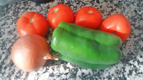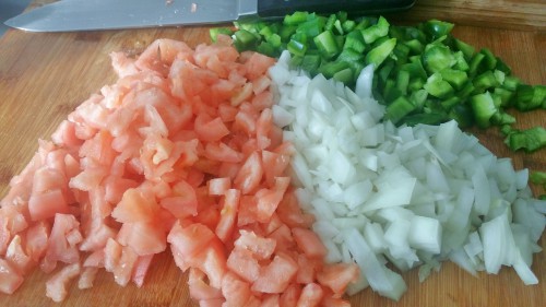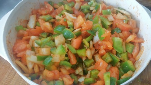 - Preparar el trampó, limpiando y cortando el tomate y el pimiento verde a cuadraditos y la cebolla picada pero en trozos gruesos, que se vean los trozos.