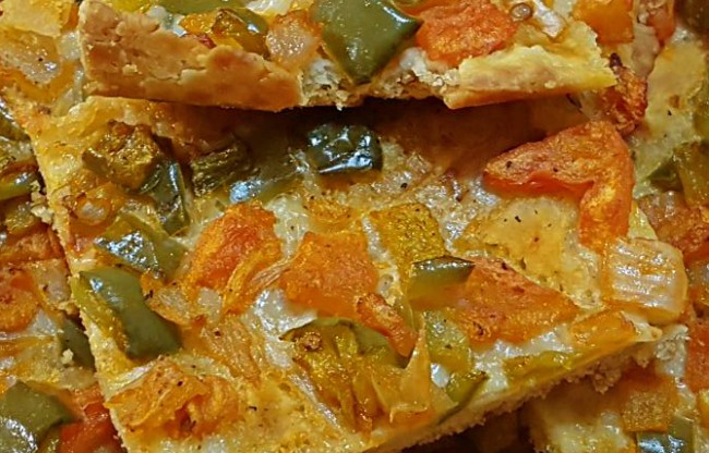 Su nombre viene del trempó, la ensalada típica mallorquina hecha con pimientos, cebollas y tomates y aliñada con sal y aceite. Esta base es la que precisamente se usa para preparar esta coca salada, prima hermana de la pizza. Maggie dice que no lleva levadura, aunque yo le he puesto un cubito de levadura fresca.