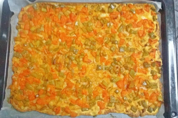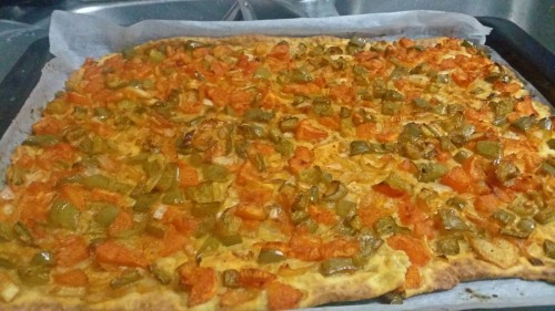 - Extender con los dedos la masa sobre un papel de horno puesto encima de una bandeja de horno. Si se quiere se puede hacer un pequeño reborde en toda la coca para que el líquido que puedan soltar las verduras no se salga