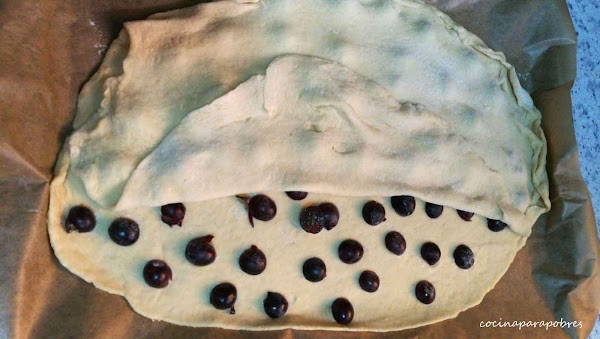 Dividimos las masa en dos y estiramos uno de los dos trozos sobre una superficie enharinada, la colocamos sobre la bandeja del horno previamente forrada con papel de hornear.