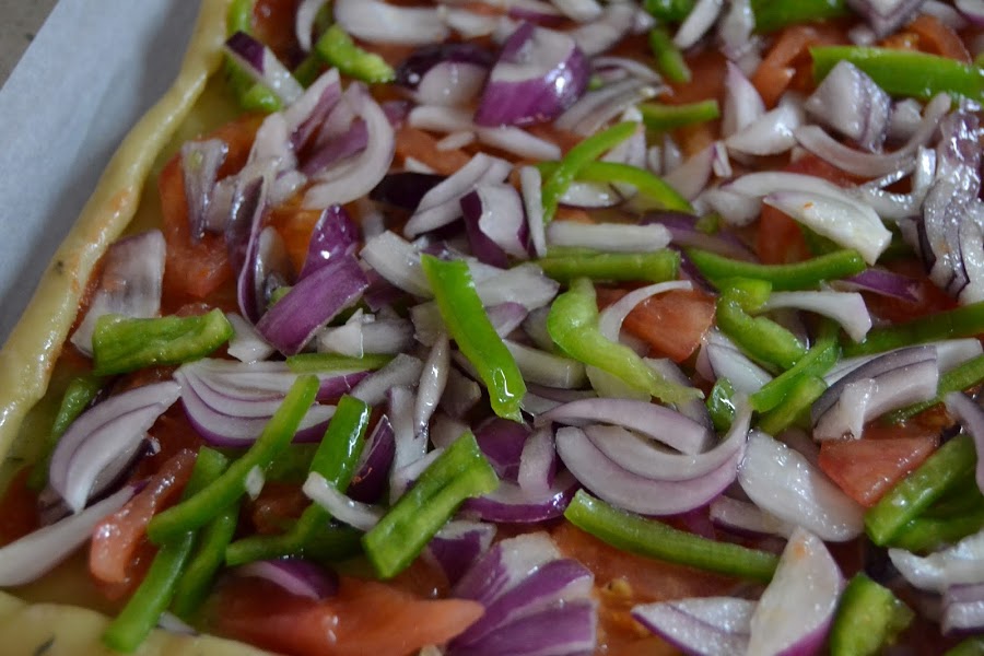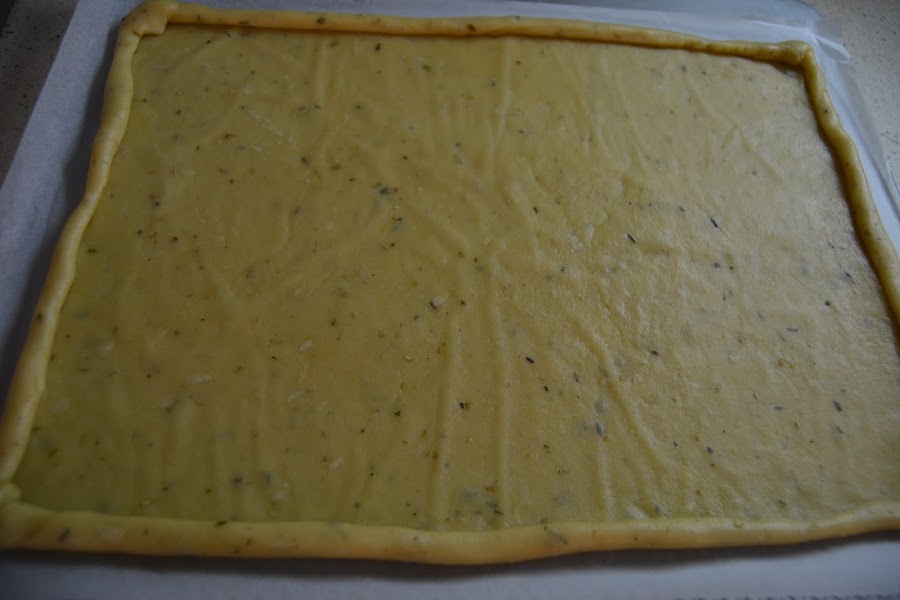 En la encimera echamos un poco de harina y estiramos la masa con un rodillo y la dejamos muy finita, también lo podemos hacer encima del papel que vayamos a utilizar para el horno. Le hacemos un borde alrededor para contener el relleno y la dejamos caer en una bandeja.