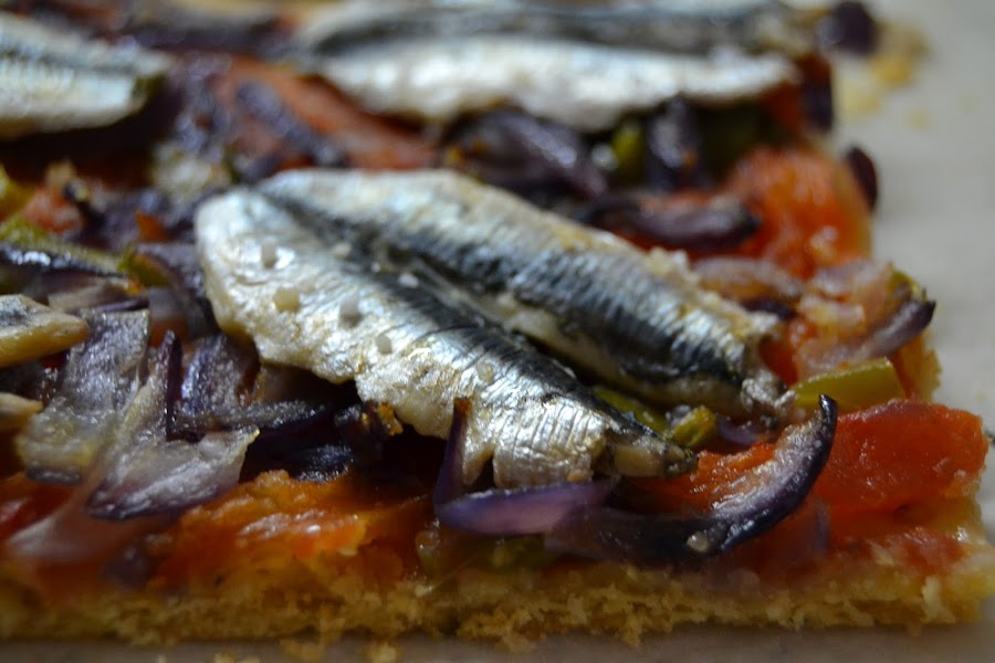 Hay quien dice que la coca es la pizza española, por la similitud, y es que ambas no dejan de ser una masa con un relleno. Pizzas he preparado muchas, esta coca era la primera vez que la hacía y tengo que decir que el resultado fue de lo mas placentero, voló literalmente. Primeramente iba a hacerla solo de verduras, pero habían quedado unos cuantos boquerones en el frigorífico, y pensé que podían ser un buen acompañamiento para estas verduritas.