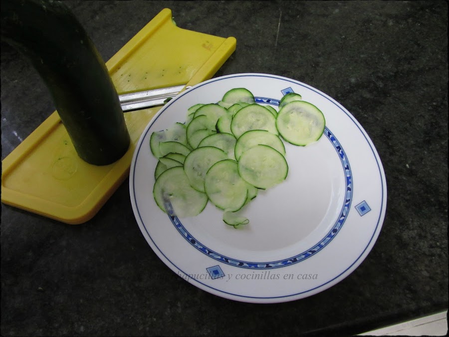 Ahora vamos cortando el calabacín previamente lavado con ayuda de una mandolina para que nos quede lo mas finito posible ya que se tiene que cocinar bien en el horno.