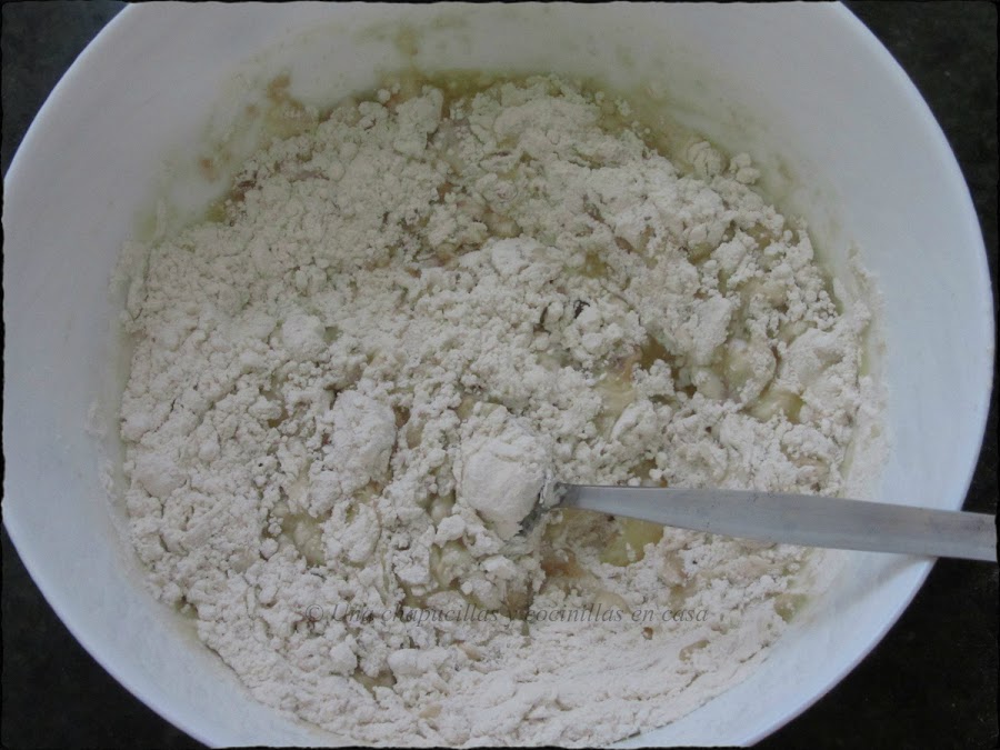 Poner en un bol todos los ingredientes de la masa y mezclarlos bien con ayuda de una cuchara.