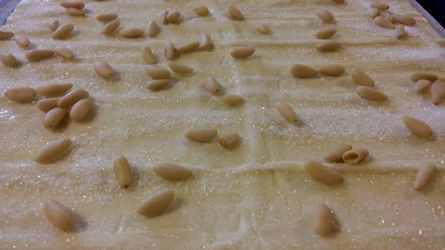 3. Echa azúcar generosamente por toda la masa y espolvorea piñones (también puede ser mezcla de piñones y almendras picadas).