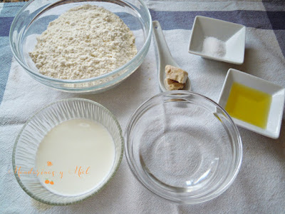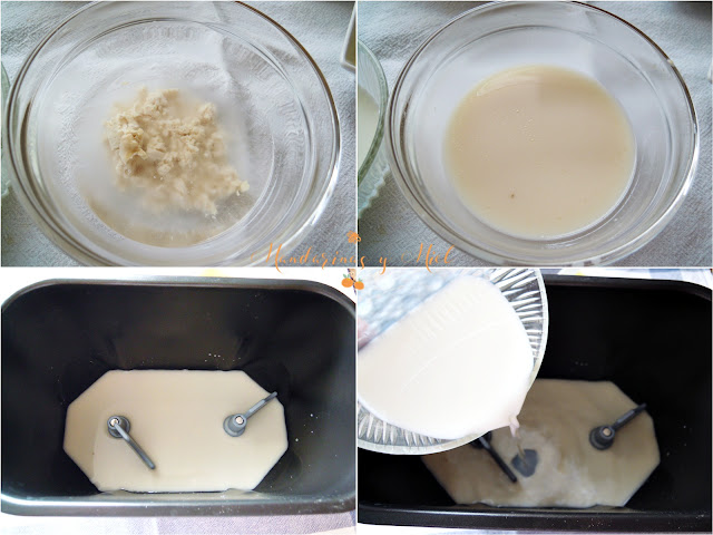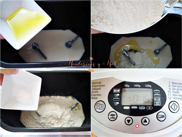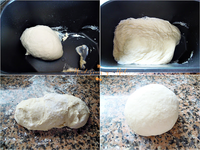 Últimamente estoy utilizando mucho la panificadora para las recetas con masas, me es muy cómodo y rápido.....pero puedes mezclar los ingredientes a mano porque esta receta es muy sencilla de hacer. Una vez tengas los ingredientes mezclados y a masados, sigue los pasos de cuando saco la masa de la panificadora.