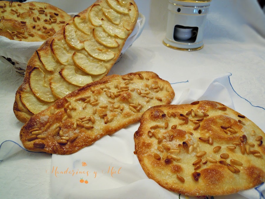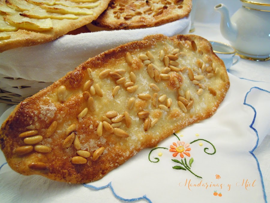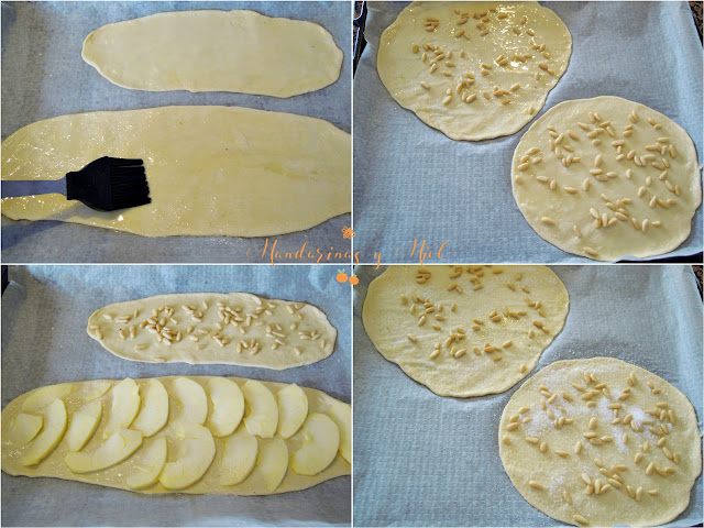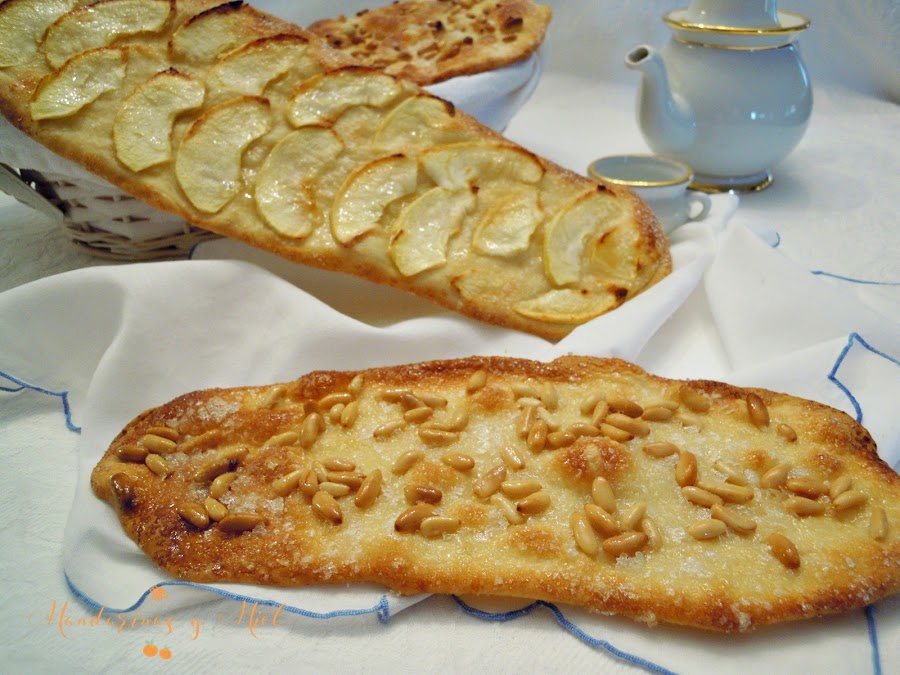 Ahora es el momento de cubrir las cocas con un puñado de piñones, láminas de manzana o dejarlas tal cual.