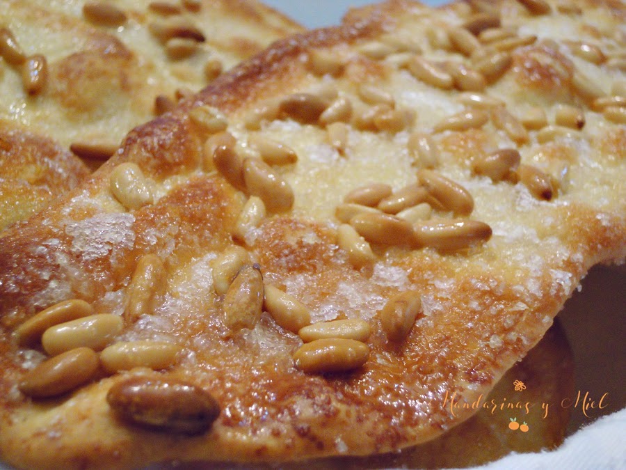 Es muy importante hacer la masa muy fina para que estas cocas queden crujientes; luego por encima, puedes hacerlas de varias maneras, como dejarlas solo con el azúcar, añadirle piñones o incluso rodajitas de manzana cortada muy fina.