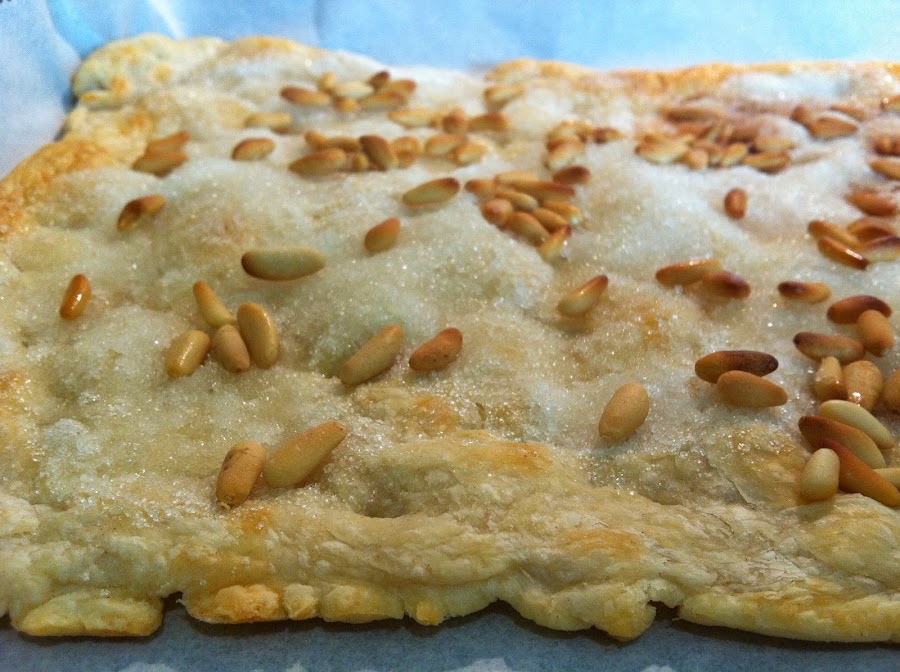 Pincelar la masa con el aceite y ponemos bastante azúcar y los piñones.