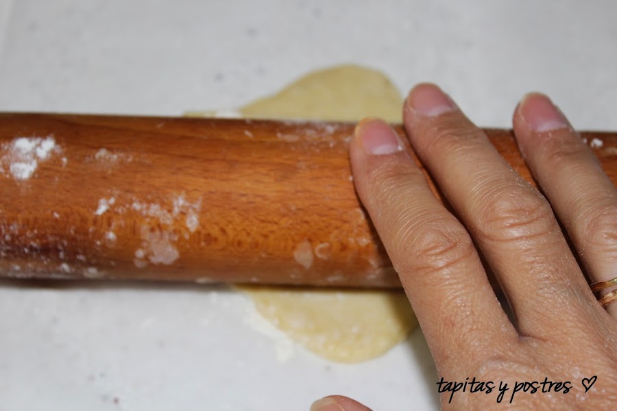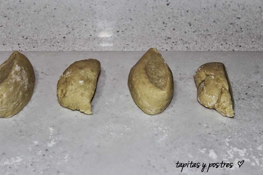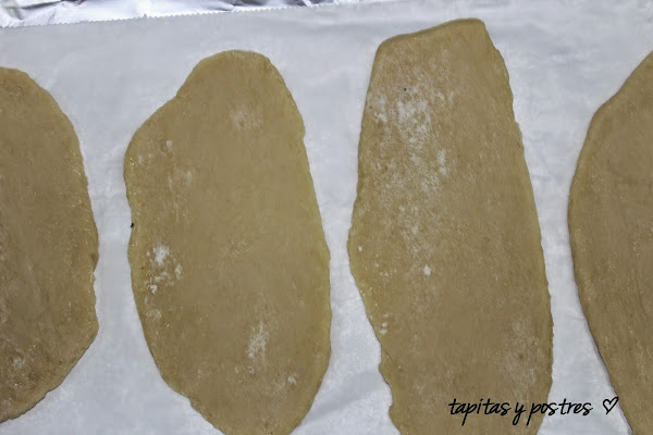 Dividir la masa en cuatro o cinco porciones iguales y estirar con un rodillo hasta dejarlas de forma ovalada y fina.