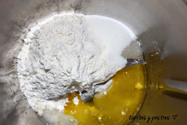 Ponemos en el vaso la harina, el aceite, el agua, el azúcar y el anís. Primero lo mezclamos.
