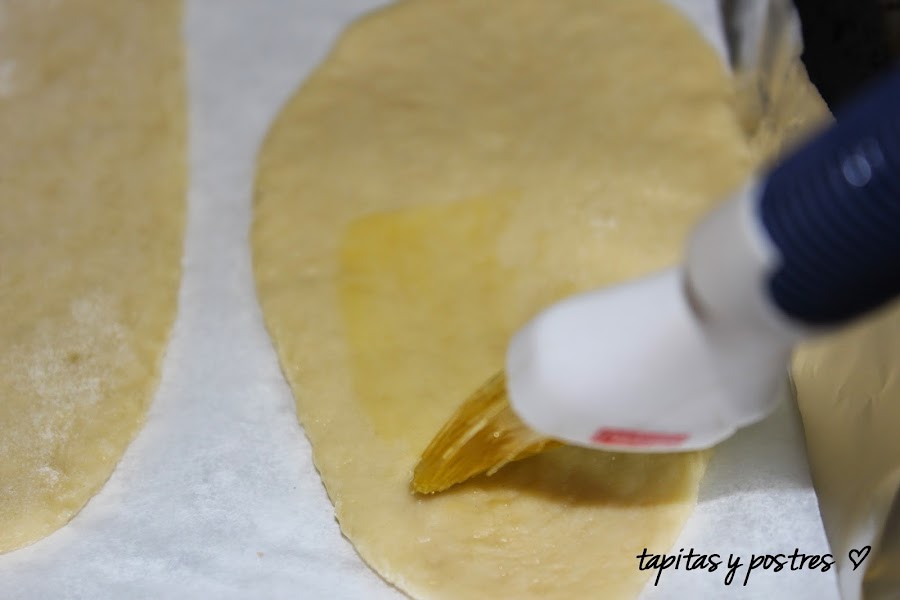 Colocarlas sobre la bandeja de horno con papel vegetal y pincelarlas con las dos cucharadas de aceite y espolvorear con azúcar.