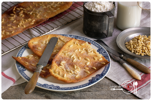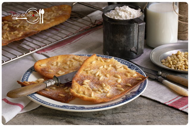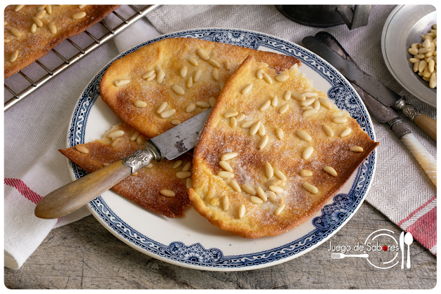 Es inevitable. Si está bien hecha, se romperá sí o sí Porque el secreto de esta coca es que sea superfina lo que la hace más crujiente. Esta sería una primera característica; la otra que tenga una cobertura brillante, lisa y casi transparente. Y eso se consigue esparciendo por encima de la masa una capa de azúcar que una vez horneada debe ser regada de forma generosa con un chorro de anís. El contraste entre el calor del azúcar y el alcohol del anís provoca una cristalización inmediata y le da a la coca como una capa de barniz. El complemento ideal es un puñado de piñones.