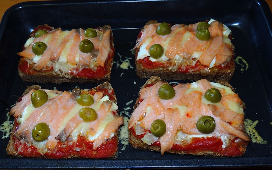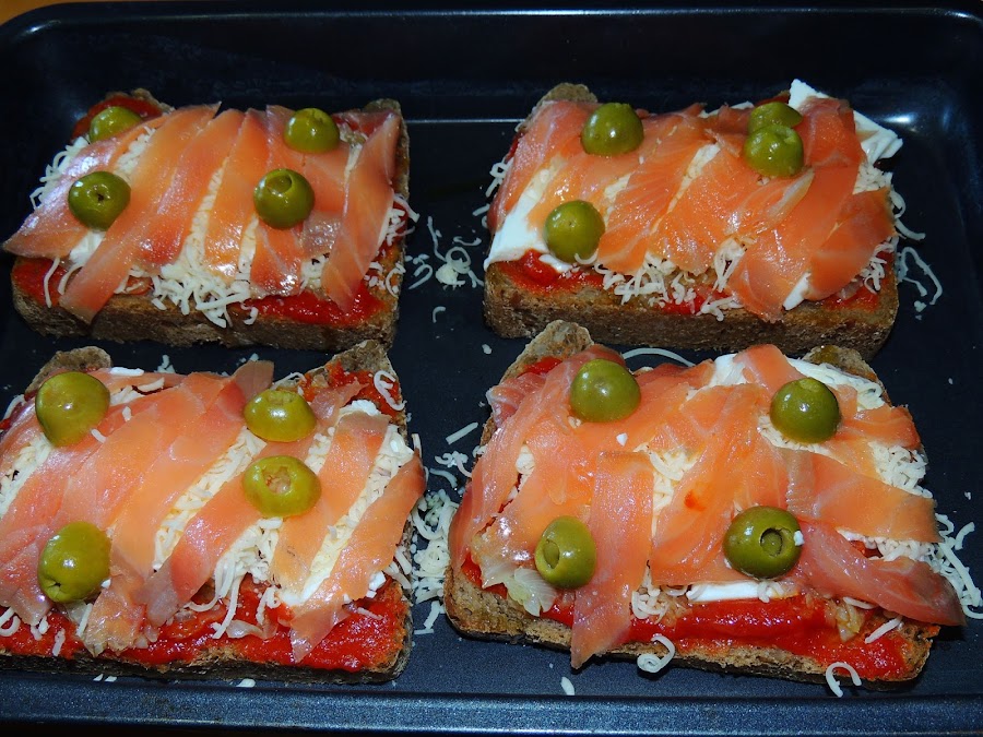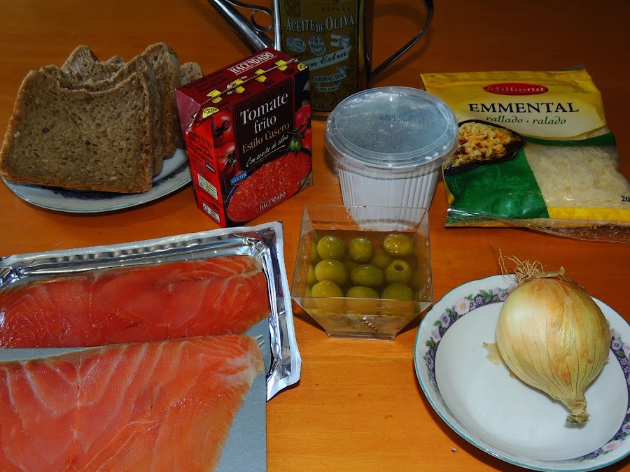 4 rebanadas de pan de chapata o de cualquier buen pan (yo he utilizado el que hice en mi panificadora con una mezcla de harina de trigo y centeno con semillas), una cebolla pequeña, medio queso blanco tipo Burgos (también puede ser mozzarella), 150 gr. de queso rallado, 100 gr. de salmón ahumado, aceitunas rellenas, 100 gr. de salsa de tomate o tomate frito, aceite de oliva y orégano,