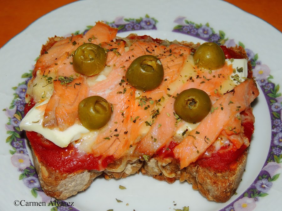 Después, el queso blanco en rodajas finas y se espolvorea con el queso rallado. Por último, se coloca el salmón cortado a trocitos y las aceitunas partidas por la mitad.