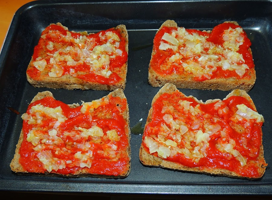 Se precalienta el horno a 200º. Se corta la cebolla muy fina y se pocha en la sartén con un poco de aceite de oliva. Mientras se va haciendo, se ponen las rebanadas de pan en una bandeja de horno, se unta con aceite de oliva y se le extiende la salsa de tomate.