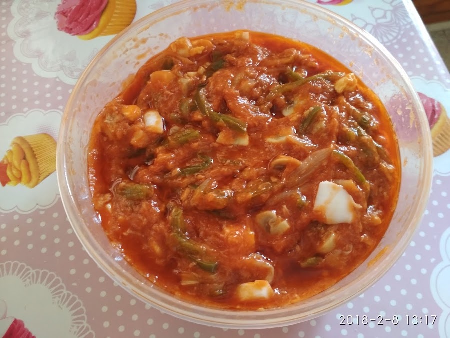 En una sartén ponemos un chorrito de aceite de oliva y añadimos la cebolla (partida por la mitad y cortada en juliana fina), en cuanto esté un minuto se añade el pimiento también en tiras finas. Lo dejamos que se poche, sin que se dore, y añadimos el champiñón cortado pequeño y le damos unas vueltas, añadimos el atún escurrido y el tomate frito. En cuanto se atempere le ponemos el huevo duro picadito.