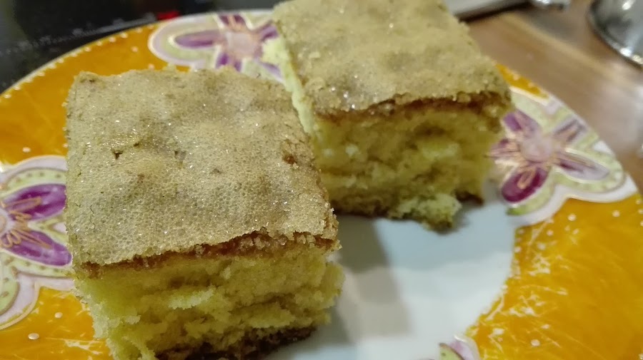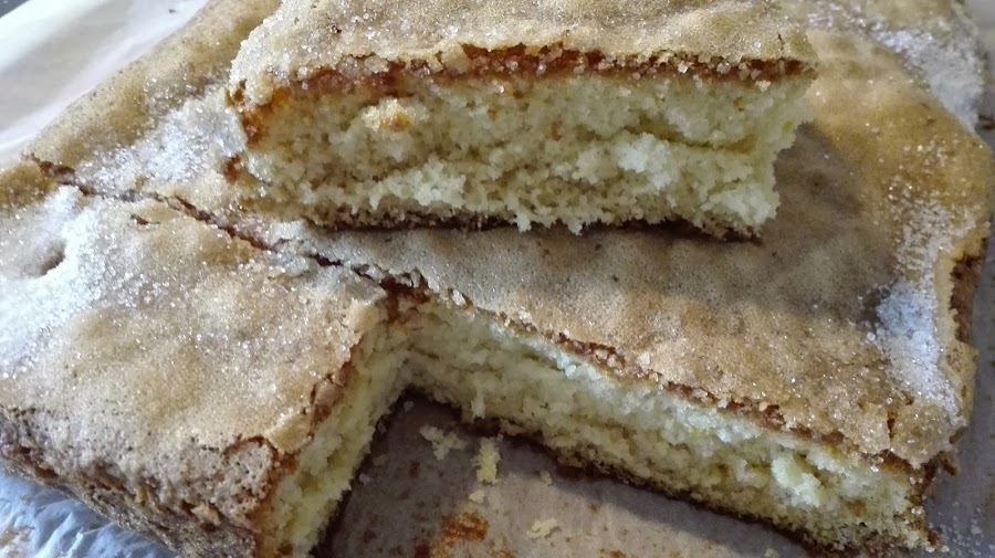 - Forrar un molde con papel de horno, verter la masa y espolvorear azúcar por encima como si no hubiera un mañana.