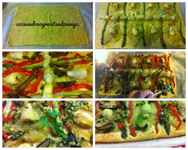 Ponemos en la base las cebollas caramelizadas, los espárragos y las alcachofas. Continuamos con las tiras de pimiento rojo y ponemos a hornear a 200º-180º unos 15 minutos. El ajo y perejil picado con aceite que habiamos reservado lo ponemos sobre la masa y lo volvemos a introducir en el horno unos 10 minutos más. Ahora a disfrutarla. Es una receta fácil y rápida de hacer ya que no necesita tiempo para la masa de levado y seguro que os cautivará.