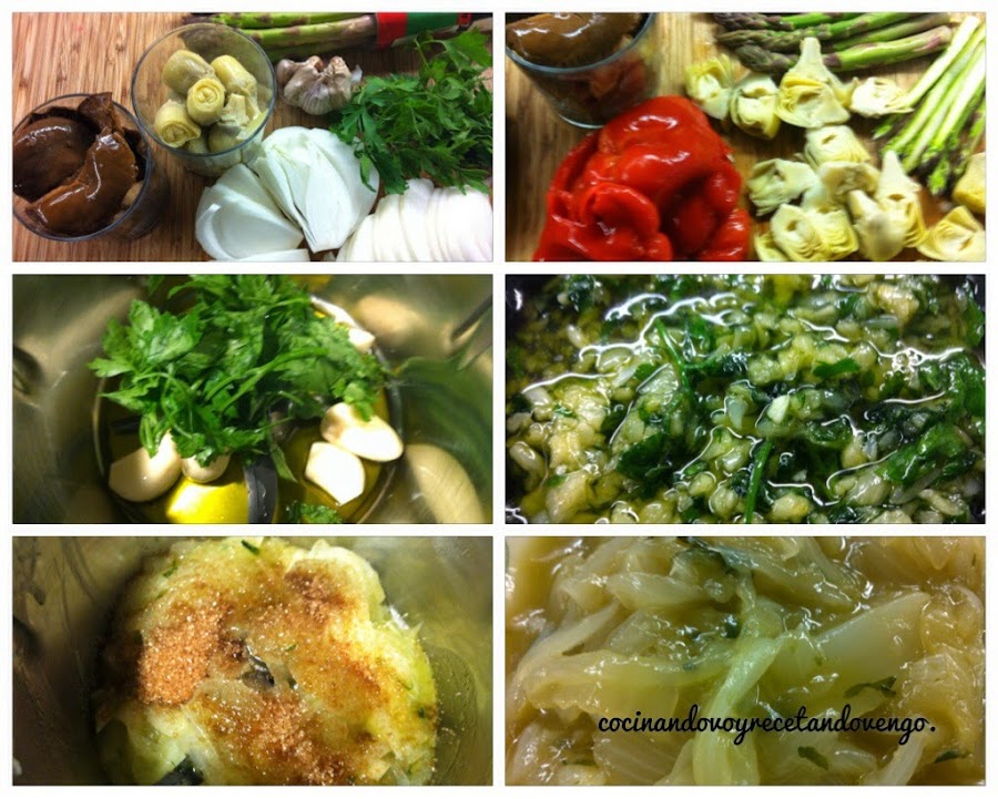 Picamos unas cebollas y las sofreimos unos minutos con un hilo de aceite, pasados unos minutos les añadimos una cucharada de azúcar morena y las caramelizamos unos minutos. Las reservamos y será el primer ingrediente que pondremos sobre la masa de la pizza. Cortamos los espárragos por la mitad, las alcachofas y tiras del pimiento. Pues ya está todo preparado para montar la Coca Mallorquina.