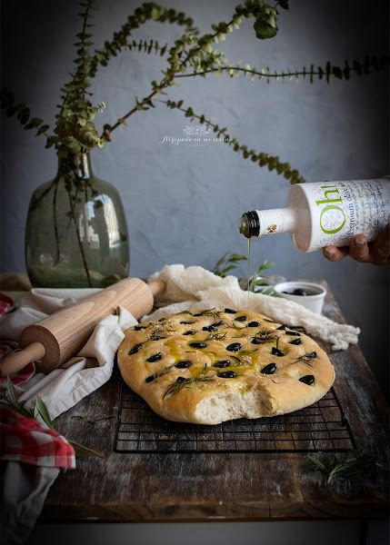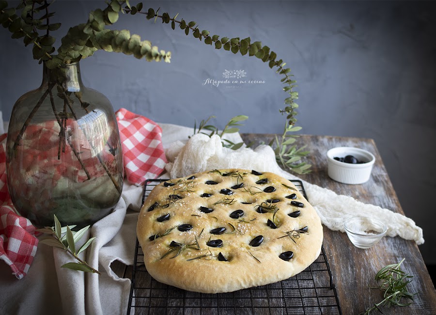Cuando haya pasado la media hora con la ayuda de los nudillos hacemos unas hendiduras en la masa y vamos disponiendo dentro de ellas las aceitunas negras cortadas en rodajas, añadimos flor de sal por encima, romero fresco y un hilo de aceite de oliva virgen extra. Llevamos al horno durante 15 minutos. Cuando esté dorada sacamos y dejamos sobre una rejilla. Caliente está de lujo, pero también podéis tomarla templada y fría.