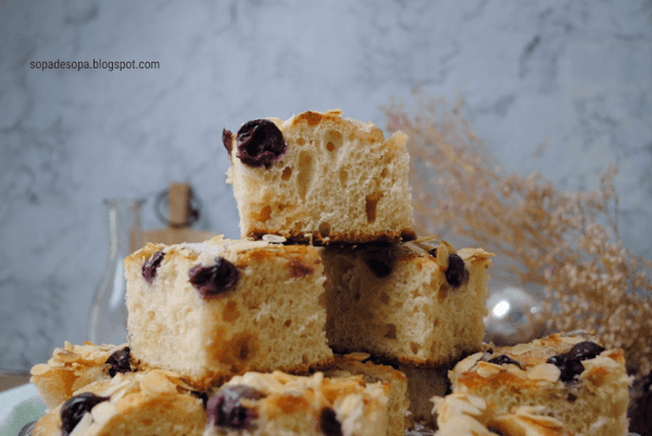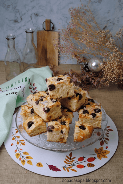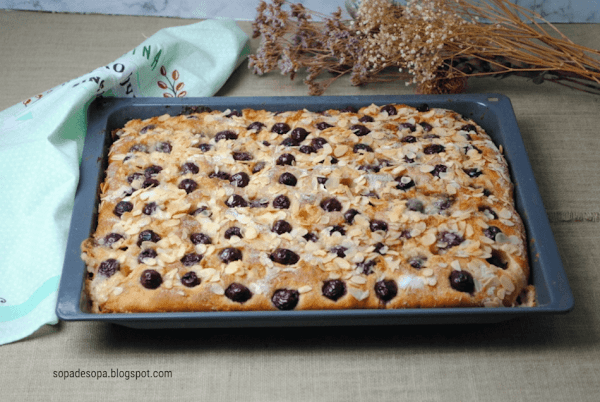 Terminar de repartir por encima las cerezas y las láminas de almendras. Espolvorear también con el resto del azúcar.