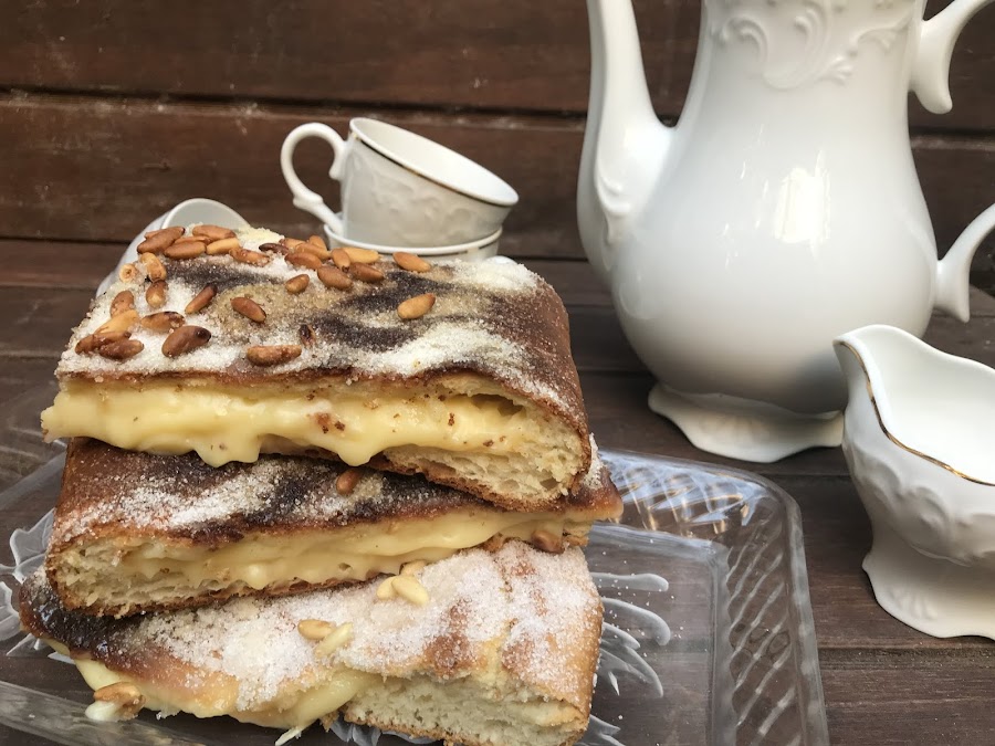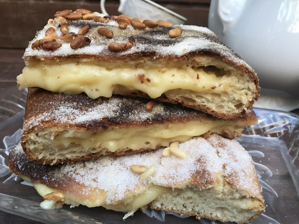 Con nuestra crema ya lista comenzamos a preparar la coca. Lo primero que debemos hacer es poner en un bol la harina en forma de volcán. En el centro añadimos los huevos, el azúcar, la sal, la ralladura de limón, la mantequilla y la leche (reservando un poquito de ella). Mezclamos bien. Seguidamente añadimos la levadura que habremos disuelto en la leche reservada y amasamos durante al menos 20 minutos, hasta lograr una masa manejable que dejaremos reposar hasta que doble su volumen. Cuando haya levado extendemos bien la masa con las manos, colocamos sobre ella la crema pastelera y replegamos una mitad de la masa sobre la otra (como si fuese una empanadilla). Espolvoreamos con azúcar de forma generosa y, esto es opcional, con piñones (yo los piñones los puse a mitad de horneado para evitar que se quemasen). Horneamos a 180 gramos hasta que esté bien doradita y listo.