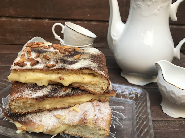 Comenzamos elaborando la crema de relleno. Para ello ponemos a hervir la leche junto a la canela y la piel de limón. Una vez hervida la colamos y cuando atempere vamos añadiendo (muy despacio y sin dejar de remover) las yemas que previamente habremos batido muy bien junto al azúcar. Cuando esté todo bien integrado añadimos la harina de maíz disuelta en un poco de leche y llevamos toda la mezcla al fuego hasta que espese. Reservamos.