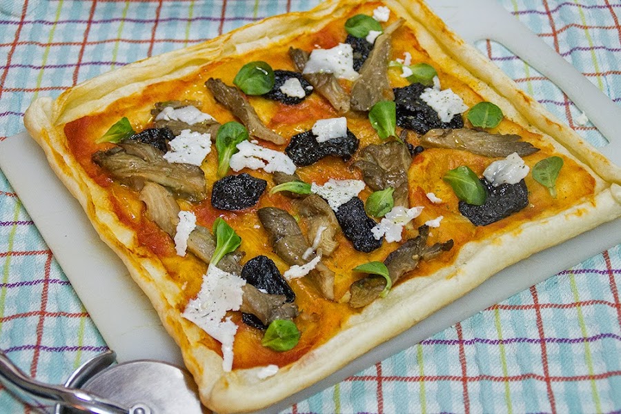 Sacamos el hojaldre del horno y colocamos por encima los tomates secos en aceite y las setas bien escurridos. Metemos en el horno quince minutos más.
