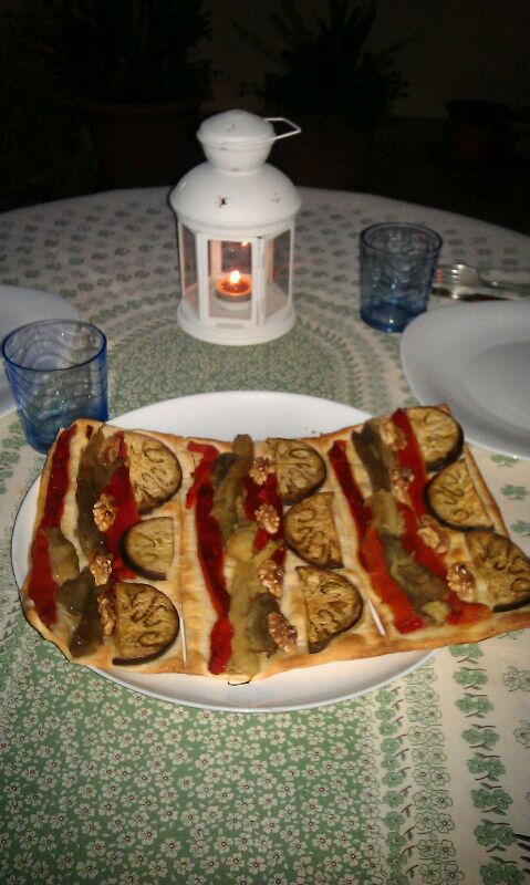 Sobre la masa, se colocan los ingredientes de forma vistosa, se le añaden las nueces por encima y antes de ponerlo al horno se añade un chorrito de aceite.