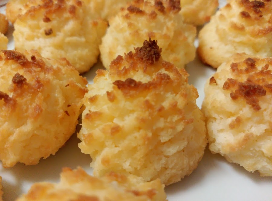 Bate las claras a punto de nueve lo mas firme posible y mezcla con el coco y el azúcar, hazlo lo mas suave posible para que baje lo menos posible. Déjalo reposar en la nevera al menos media hora, así el coco se hidratará un poco y quedará mas rico.