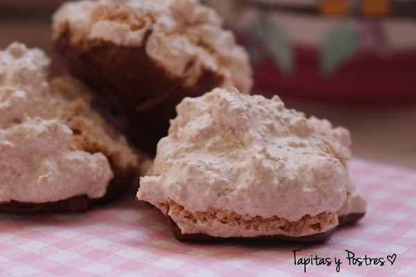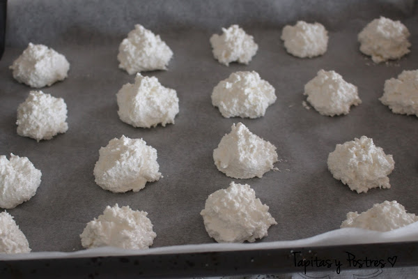 Precalentamos el horno con calor arriba y abajo a 120º. Ponemos montones de la mezcla en una bandeja de horno con papel de hornear. Lo hacemos con una cuchara y damos forma de pirámide. Horneamos unos 50 minutos. Dejamos en la bandeja fuera del horno unos cinco minutos y después los dejamos en una rejilla para que enfríen bien.