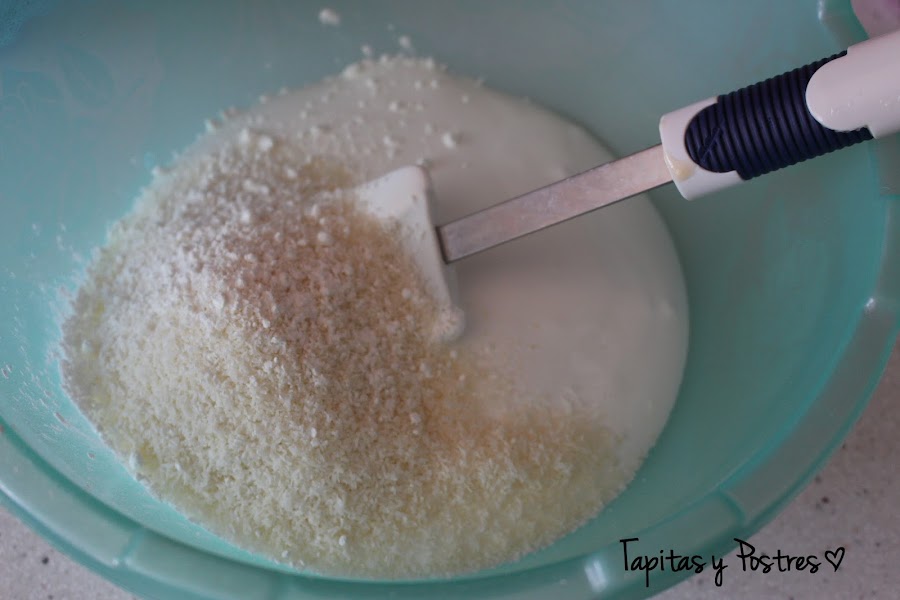 Añadimos el resto del coco y la maicena. Terminamos e integrar todo.