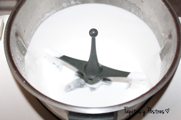 Ponemos las claras y las dos clases de azúcar ( podéis poner una sola clase de azúcar) en el vaso de la thermomix y programamos 4 minutos, 50º, velocidad 3 ½. Al acabar volvemos a montar otros 4 minutos a velocidad 3 ½ pero sin temperatura. Nos quedará un merengue no excesivamente montado. Así va bien.