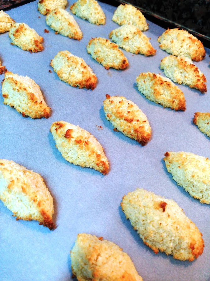 Podemos hacer rizos de coco con una manga pastelera y una boquilla rizada grande o podemos , como yo, elaborar una especie de croquetas con dos cucharas.