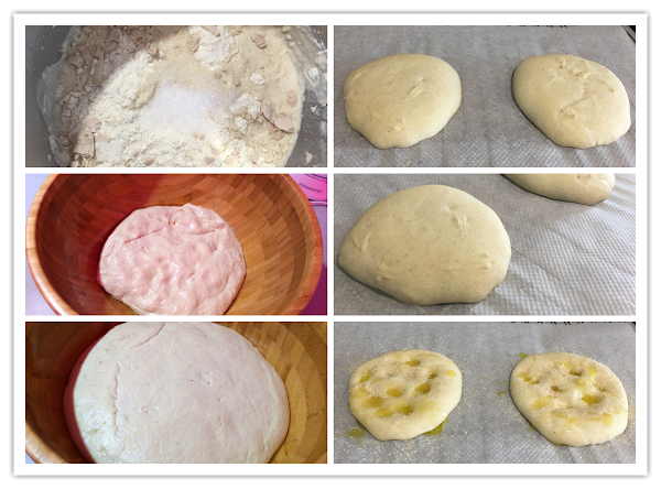 Dividimos la masa en seis porciones iguales. Las ponemos sobre la superfície de trabajo y aplanamos, dandóle una forma redondeadaa. Pasamos la masa a una bandeja de horno cubierta con papel de horno. Dejamos reposar de nuevo hasta que doble su volumen. Precalentamos el horno a 220ºC.