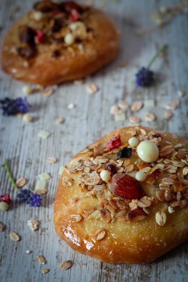 Horneamos a 220ºC durante 20 minutos. Cuando hayan pasado 15 minutos añadimoos los 200g de muesli por encima, si lo hiciéramos antes quedaría demasiado tostado. Poniéndolos a 5 minutos de la cocción final quedan perfectas.