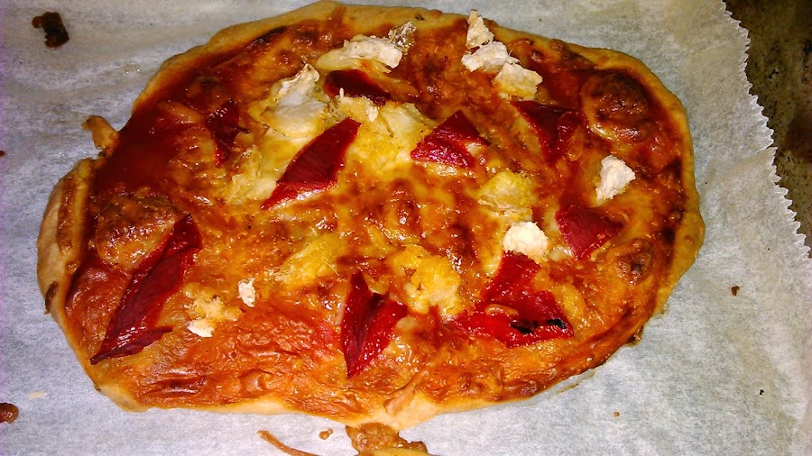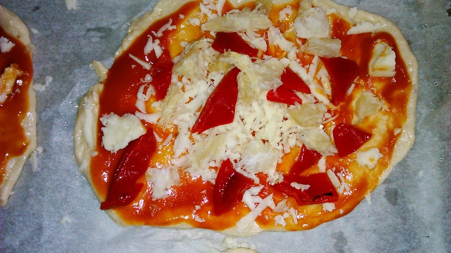 Untamos con tomate frito y espolvoreamos el queso rallado. Repartimos el pimiento en trocitos.